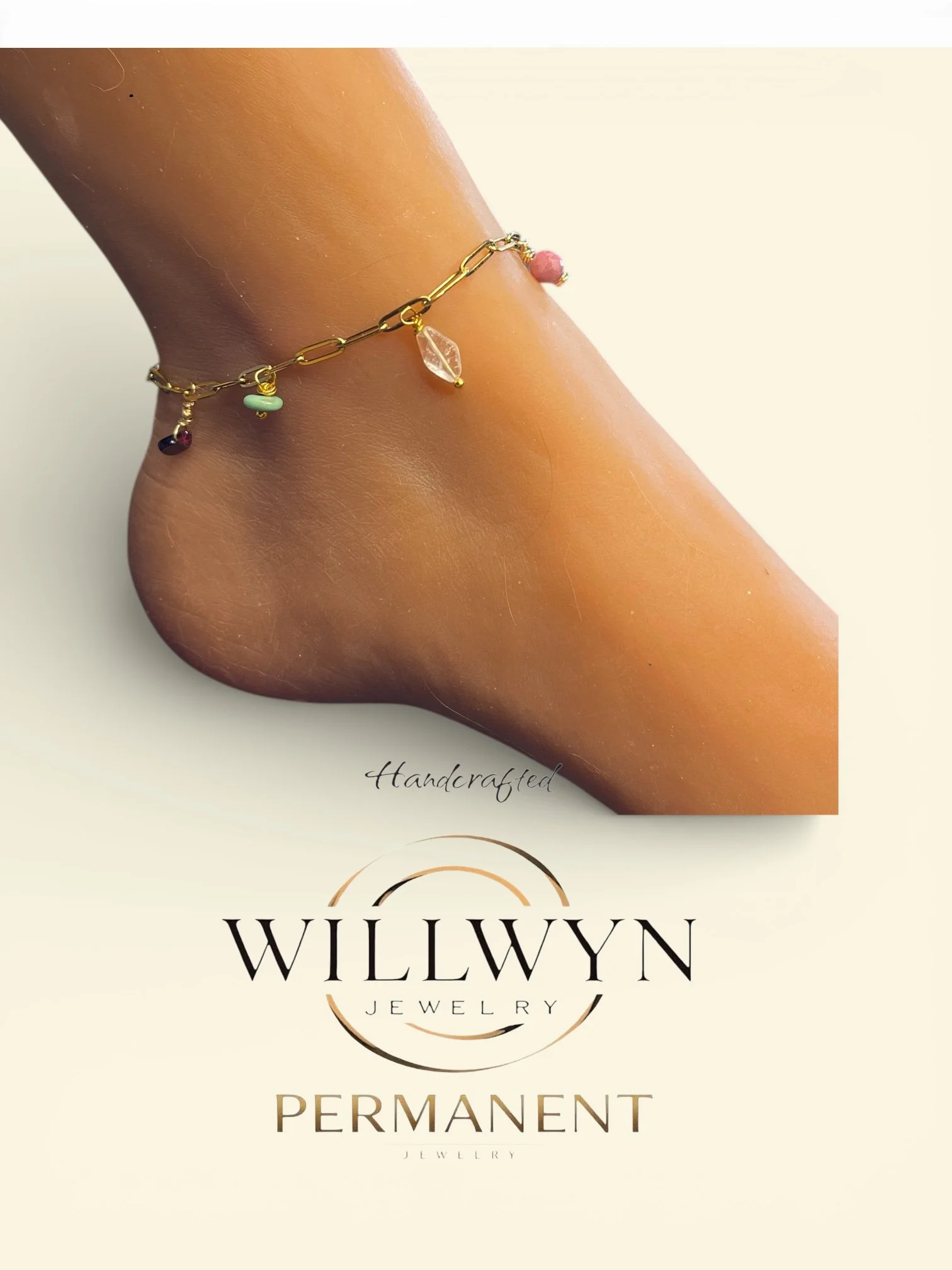Show your unique style with a beautiful custom made jewelry piece. Permanent jewelry is micro welded sterling silver, gold filled and other precious metal chain for a permanent anklet, bracelet, necklace, ring or toe ring. At WILLWYN we use semi-precious stones and charms to create your customized jewelry. Email Willwyn-kristinaclark@outlook.com and Book your appointment today!